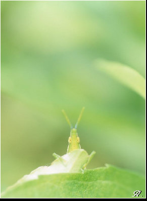 葉っぱの陰から顔を覗かせているバッタ君