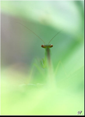 緑のジャングルの中で、小さなカマキリ君の姿を発見!
